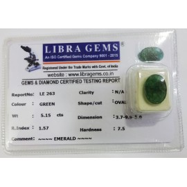 REPORT.NO.- LE 263CLARITY.-N/ACOLOUR.-GREENSHAPE/CUT.-OVALWT.-5.15 CTSDIMENSION.-3-7.9-9.5-6.R.INDEX.-1.57HARDNESS.-7.5COMMENT.-EMERALD..