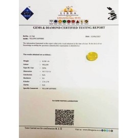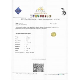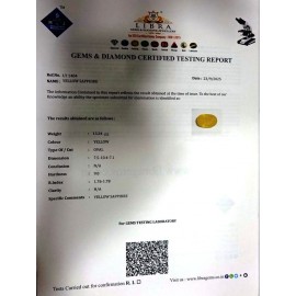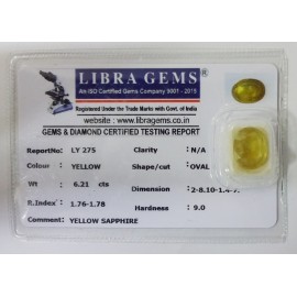 REPORT NO . LY 275CLARITY . N/ACOLOUR . YELLOWSHAPE / CUT . OVALWT . 6.21 CTSDIMENSION . 2-8.10-1.4-7.R . INDEX . 1.76-1.78HARDNESS . 9.0COMMENT . YELLOW SAPPHIRE..
