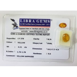 REPORT.NO.-LYA 134CLARITY.-N/ACOLOUR.-YELLOWSHAPE/CUT.-OVALWT.-3.72 CTSDIMENSION.-10-5.8-8.3-7.R.INDEX.-1.76-1.78HARDNESS.-9.0COMMENT.-YELLOW SAPPHIRE { A }..