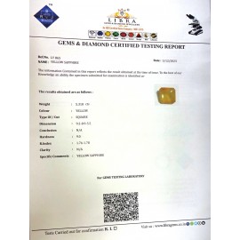 REPORT.NO.LYA 181CLARITY.N/ACOLOUR.YELLOWSHAPE/CUT.OVALWT.3.02 CTSDIMENSION9.2-7.6-4.2.R.INDEX.1.76-1.78HARDNESS.9.0COMMENT.YELLOW SAPPHIRE {A}..