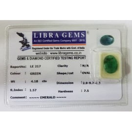 REPORT.NO.-LE 217CLARITY.-N/ACOLOUR.-GREENSHAPE/CUT.-OVALWT.-4.18 CTSDIMENSION.-2-9.9-7.4-3.R.INDEX.-1.57HARDNESS.-7.5COMMENT.-EMERALD..