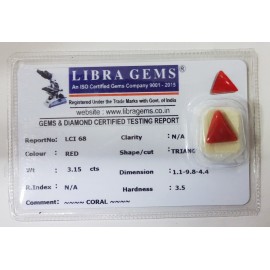 REPORT NO . LCI 68CLARITY . N/ACOLOUR . REDSHAPE / CUT . TRIANGLEWT . 3.15 CTSDIMENSION . 1-1.9-8.4-4.R . INDEX . N/AHARDNESS . 3.5COMMENT . CORAL..