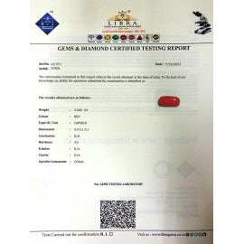 REPORT NO . LCI 161CLARITY . N/ACOLOUR . REDSHAPE / CUT . CAPSULEWT . 3.72 CTSDIMESION . 4-3.5-5.5-6.R . INDEX . N/AHARDNESS . 3.5COMMENT . CORAL..