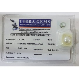 REPORT NO . LP 184CLARITY . N/ACOLOUR . SHINING WHITESHAPE / CUT . ROUNDWT . 3.95 CTSDIMENSION . 9-1.9-1.5-9.R . INDEX . N/AHARDNESS . 3.0COMMENT . PEARL..