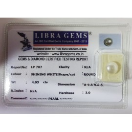 REPORT NO . LP 787CLARITY . N/ACOLOUR . SHINING WHITESHAPE / CUT . ROUNDWT . 4.03 CTSDIMENSION . 8-9.8-9.6-6.R . INDEX . N/AHARDNESS . 3.0COMMENT . PEARL..