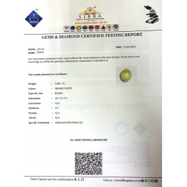 REPORT.NO.LP 1121CLARITY.N/ACOLOUR.SHINING WHITE SHAPE/CUT.ROUNDWT. 5.38 CTS DIMENSION.10.3-10.3-6.7R.INDEX.N/A HARDNESS.3.0COMMENT.PEARL..