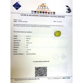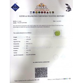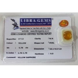 REPORT NO . LYA 12CLARITY . N/ACOLOUR . YELLOWSHAPE / CUT . OVALWT . 4.38 CTSDIMENSION . 1-2.8-1.5-6.R . INDEX . 1.76-1.78HARDNESS . 9.0COMMENT . YELLOW SAPPHIRE..