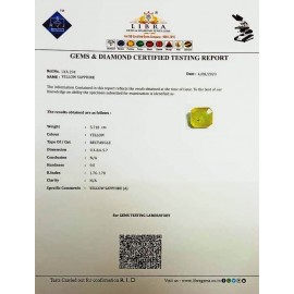 DATE:4-8-2023REF.NO:LYA 294NAME:YELLOW SAPPHIREWEIGHT:5.71 CTSCOLOUR:YELLOWTYPE OF/CUT:RECTANGLEDIMENSION:9.3-8.6-5.7CONCLUSION:N/AHARDNESS:9.0R.INDEX:1.76-1.78CLARITY:N/ASPECIFIC COMMENTS:Y..