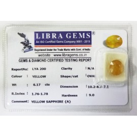 REPORT.NO.-LYA 200CLARITY.-N/ACOLOUR.-YELLOWSHAPE/CUT.-OVALWT.-6.17 CTSDIMENSION.-10-2.8-7.7-1.R.INDEX.-1.76-1.78HARDNESS.-9.0COMMENT.-YELLOW SAPPHIRE { A }..