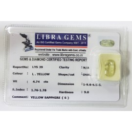 REPORT NO . LYS 39CLARITY . N/ACOLOUR . L . YELLOWSHAPE / CUT . OVALWT . 4.74 CTSDIMENSION . 1-9.6-6.5-6.R . INDEX . 1.76-1.78HARDNESS . 9.0COMMENT . YELLOW SAPPHIRE { S }..