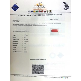 REPORT NO . LCI 169CLARITY . N/ACOLOUR . REDSHAPE / CUT . CAPSULEWT . 4.31 CTSDIMENSION . 6-3.5-8.5-1.R . INDEX . N/AHARDNESS . 3.5COMMENT . CORAL..