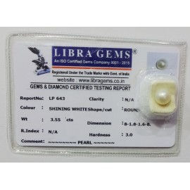 REPORT NO . LP 643CLARITY . N/ACOLOUR . SHINING WHITESHAPE / CUT . ROUNDWT . 3.55 CTSDIMENSION . 8-1.8-1.6-8.R . INDEX . N/AHARDNESS . 3.0COMMENT . PEARL..