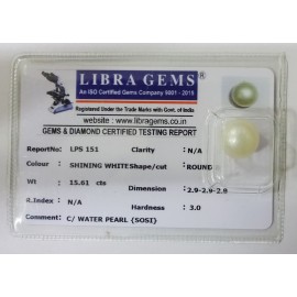 REPORT NO . LPS 151CLARITY . N/ACOLOUR . SHINING WHITESHAPE / CUT . ROUNDWT . 15.61 CTSDIMENSION . 2-9.2-9.2-9.R . INDEX . N/AHARDNESS . 3.0COMMENT . C / WATER PEARL { SOSI }..