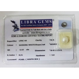 REPORT NO . LPSC 44CLARITY . N/ACOLOUR . SHINING WHITESHAPE / CUT . ROUNDWT . 4.43 CTSDIMENSION . 8-8.8-9.8-8.R . INDEX . N/AHARDNESS . 3.0COMMENT . PEARL { SOUTH SEA }..