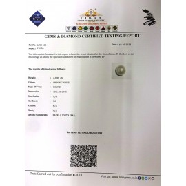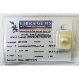 REPORT.NO.LPSC 204CLARITY.N/ACOLOUR.SHINING WHITESHAPE/CUT.ROUND WT.6.69 CTSDIMENSION.10.1-10.1-9.4R.INDEX.N/AHARDNESS.3.0COMMENT.PEARL {SOUTH SEA}..