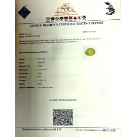 REPORT NO . LY-63CLARITY . N/ACOLOUR . YELLOWSHAPE / CUT . OVALWT . 5.56 CTSDIMENSION . 1-3.8-7.5-7.R . INDEX . 1.76-1.78HARDNESS . 9.0COMMENT . YELLOW SAPPHIRE..