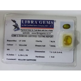 REPORT NO . LY 246CLARITY . N/ACOLOUR . YELLOWSHAPE / CUT . OVALWT . 4.81 CTSDIMENSION . 1-1.8-3.4-6.R . INDEX . 1.76-1.78HARDNESS . 9.0COMMENT . YELLOW SAPPHIRE..