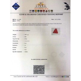 REPORT.NO.LCI 499CLARITY.N/ACOLOUR.REDSHAPE/CUT.CAPSULEWT.3.90 CTSDIMENSION.6.5-5.2-5.1R.INDEX.N/AHARDNESS.3.5COMMENT.CORAL..