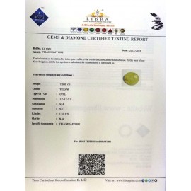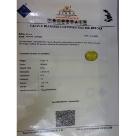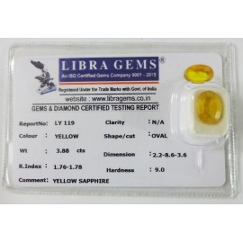 REPORT NO . LY 119CLARITY . N/ACOLOUR . YELLOWSHAPE / CUT . OVALWT . 3.88 CTSDIMENSION . 2-2.8-6.3-6.R . INDEX . 1.76-1.78HARDNESS . 9.0COMMENT . YELLOW SAPPHIRE..