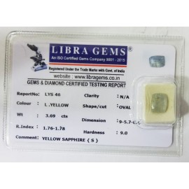 REPORT NO . LYS 46CLARITY . N/ACOLOUR . L . YELLOWSHAPE / CUT . OVALWT . 3.69 CTSDIMENSION . 9-5.7-6.4-7.R . INDEX . 1.76-1.78HARDNESS . 9.0COMMENT . YELLOW SAPPHIRE { S }..