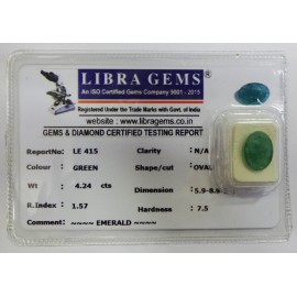 REPORT.NO.LE 415CLARITY.N/ACOLOUR.GREENSHAPE/CUT.OVALWT.4.24 CTSDIMENSION. 5-9.8-9.2-1.R.INDEX.1.57HARDNESS.7.5COMMENT.EMERALD..