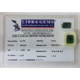 REPORT NO . LE 90CLARITY . N/ACOLOUR . GREENSHAPE / CUT . RECTANGLEWT . 3.00 CTSDIMENSION . 9-8.7-8.4-9.R . INDEX . 1.57HARDNESS . 7.5COMMENT . EMERALD..