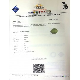 REPORT.NO.LC 760CLARITY.N/ACOLOUR.GREEN SHAE/CUT.OVAL WT.6.75 CTS DIMENSION.2.3-10.4-7.6R.INDEX.1.54-1.55HARDNESS.7.5COMMENT.CATS EYE {S.QUATRZ}..