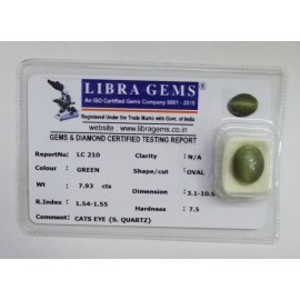 REPORT NO . LC 210CLARITY . N/ACOLOUR . GREENSHAPE / CUT . OVALWT . 7.93 CTSDIMENSION . 3-1.10-5.7-7.R . INDEX . 1.54-1.55HARDNESS . 7.5COMMENT . CATS EYE { S . QUARTZ }..