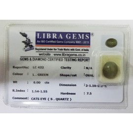 REPORT NO . LC 128CLARITY . N/ACOLOUR . L . GREENSHAPE / CUT . OVALWT . 5.02 CTSDIMENSION . 1-1.9-5.6-9.R . INDEX . 1.54-1.55HARDNESS . 7.5COMMENT . CATS EYE { S . QUARTZ }..