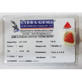 REPORT NO . LCI 126CLARITY . N/ACOLOUR . REDSHAPE / CUT . TRIANGLEWT . 4.54 CTSDIMENSION . 10-5.1-3.5-6.R . INDEX . N/AHARDNESS . 3.5COMMENT . CORAL..