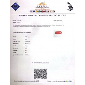 REPORT.NO.LCI 557CLARITY.N/ACOLOUR.REDSHAPE/CUT.CAPSULEWT.6.62 CTS DIMENSION.6.6-6.9-6.8R.INDEX.N/AHARDNESS.3.5COMMENT.CORAL ..