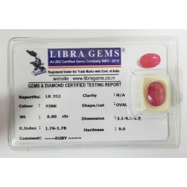 REPORT.NO.-LR 352CLARITY.-N/ACOLOUR.-PINKSHAPE/CUT.-OVALWT.-8.80 CTSDIMENSION.-3.1-9.2-6.8R.INDEX.-1.76-1.78HARDNESS.-9.0COMMENT.-RUBY..