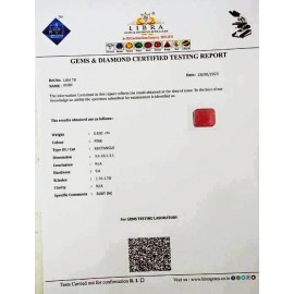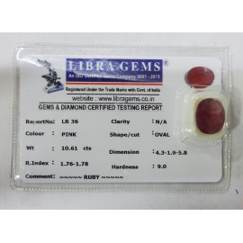 REPORT NO . LR 36CLARITY . N/ACOLOUR . PINKSHAPE / CUT . OVALWT . 10.61 CTSDIMENSION . 4-3.1-9.5-8.R . INDEX . 1.76-1.78HARDNESS . 9.0COMMENT . RUBY..