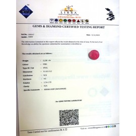 DATE:5-12-2023REF.NO:LRB 47NAME:RUBYWEIGHT:3.23 CTSCOLOUR:PINKTYPE OF/CUT:OVALDIMENSION:9.1-8.1-5.2CONCLUSION:N/AHARDNESS:9.0R.INDEX:1.76-1.78CLARITY:N/ASPECIFIC COMMENTS;BURMA RUBY {MAYANMA..