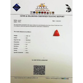 REPORT NO . LCI 115CLARITY . N/ACOLOUR . REDSHAPE / CUT . TRIANGLEWT . 4.85 CTSDIMENSION . 1-4.10-4.6-1.R . INDEX . N/AHARDNESS . 3.5COMMENT . CORAL..