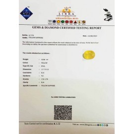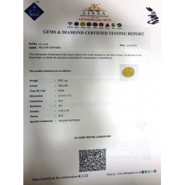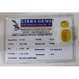 REPORT NO . LY 43CLARITY . N/ACOLOUR . YELLOWSHAPE / CUT . OVALWT . 6.96 CTSDIMENSION . 3-9.10-8.4-4.R . INDEX . 1.76-1.78HARDNESS . 9.0COMMENT . YELLOW SAPPHIRE..