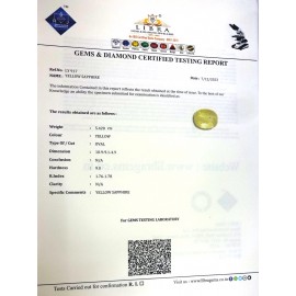 REPORT NO . LY 286CLARITY . N/ACOLOUR . YELLOWSHAPE / CUT . OVALWT . 3.56 CTSDIMENSION . 9-1.7-4.4-8.R . INDEX . 1.76-1.78HARDNESS . 9.0COMMENT . YELLOW SAPPHIRE..
