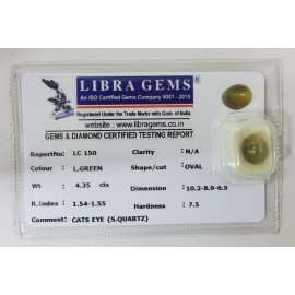 REPORT NO . LC 150CLARITY . N/ACOLOUR . L . GREENSHAPE / CUT . OVALWT . 4.35 CTSDIMENSION . 10-2.8-9.6-9.R . INDEX . 1.54-1.55HARDNESS . 7.5COMMENT . CATS EYE { S . QUARTZ }..