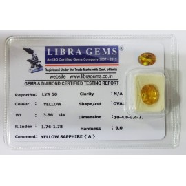 REPORT NO . LYA 50CLARITY . N/ACOLOUR . YELLOWSHAPE / CUT . OVALWT . 3.86 CTSDIMENSION . 10-4.8-5.4-7.R . INDEX . 1.76-1.78HARDNESS . 9.0COMMENT . YELLOW SAPPHIRE { A }..