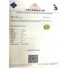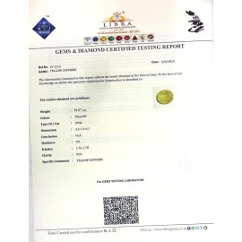 REPORT NO . LYA 19CLARITY . N/ACOLOUR . YELLOWSHAPE / CUT . OVALWT . 3.50 CTSDIMENSION . 9-7.7-4.5-3.R . INDEX . 1.76-1.78HARDNESS . 9.0COMMENT . YELLOW SAPPHIRE..