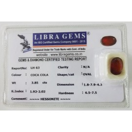 REPORT NO . LH 63CLARITY . N/ACOLOUR . COCA COLASHAPE / CUT . OVALWT . 3.85 CTSDIMENSION . 1-8.7-9.4-3.R . INDEX . 1.92-2.02HARDNESS . 6.5-7.5COMMENT . HESSONITE..