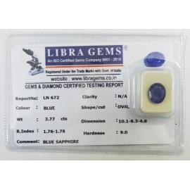 REPORT.NO.LN 672CLARITY.N/ACOLOUR.BLUESHAPE/CUT.OVAL WT.3.77 CTSDIMENSION.10.1-8.3-4.8R.INDEX.1.76-1.7.8HARDNESS.9.0COMMENT.BLUE SAPPHIRE..