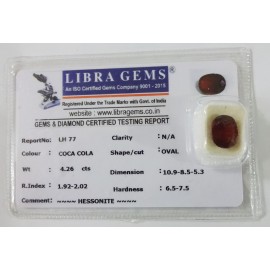 REPORT NO . LH 77CLARITY . N/ACOLOUR . COCA COLASHAPE / CUT . OVALWT . 4.26 CTSDIMENSION . 10-9.8-5.5-3.R . INDEX . 1.92-2.02HARDNESS . 6.5-7.5COMMENT . HESSONITE..