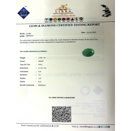 DATE:10-10-2023REF.NO:LE 980NAME:EMERALDWEIGHT:2.70 CTSCOLOUR:GREENTYPE OF/CUT:OVALDIMENSION:2-1.8-1.3-8.CONCLUSION:N/AHARDNESS:7.5R.INDEX:1.57CLARITY:N/ASPECIFIC COMMENTS:EMERALD..