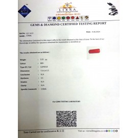 REPORT.NO.LCI 750CLARITY.N/ACOLOUR.REDSHAPE/CUT.CAPSULEWT.7.73 CTSDIMENSION.9.8-7.2-6.1R.INDEX.N/AHARDNESS.3.5COMMENT.CORAL ..