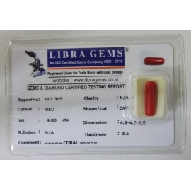 REPORT NO . LCI 305CLARITY . N/ACOLOUR . REDSHAPE / CUT . CAPSULEWT . 4.00 CTSDIMENSION . 4-8.4-7.6-8.R . INDEX . N/AHARDNESS . 3.5COMMENT . CORAL..