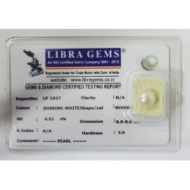 REPORT NO. LP 1037CLARITY.    N/ACOLOUR. SHINING WHITESHAPE/CUT. ROUNDWT.4.51 CTSDIMENSION. 8.9-8.9-6.7R.INDEX. N/AHARDNESS.3.0COMMENT. PEARL..