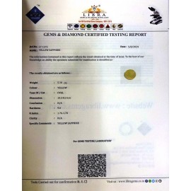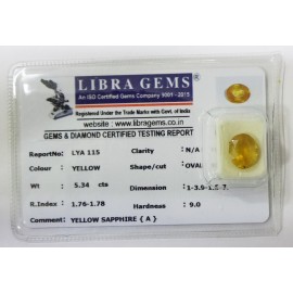 REPORT.NO.-LYA 115CLARITY.-N/ACOLOUR.-YELLOWSHAPE/CUT.-OVALWT.-5.34 CTSDIMENSION.-1-3.9-1.5-7.R.INDEX.-1.76-1.78HARDNESS.-9.0COMMENT.-YELLOW SAPPHIRE { A }..