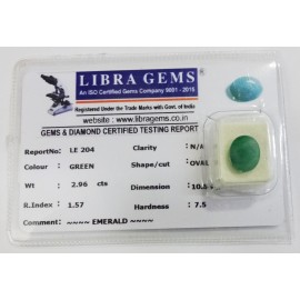 REPORT.NO.-LE 204CLARITY.-N/ACOLOUR.-GREENSHAPE/CUT.-OVALWT.-2.96 CTSDIMENSION.-10.8-8.7-4.8R.INDEX.-1.57HARDNESS.-7.5COMMENT.-EMERALD..