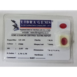 REPORT NO . LR 145CLARITY . N/ACOLOUR . PINKSHAPE / CUT . OVALWT . 2.97 CTSDIMENSION . 9-1.7-1.4-6.R . INDEX . 1.76-1.78HARDNESS . 9.0COMMENT . RUBY..